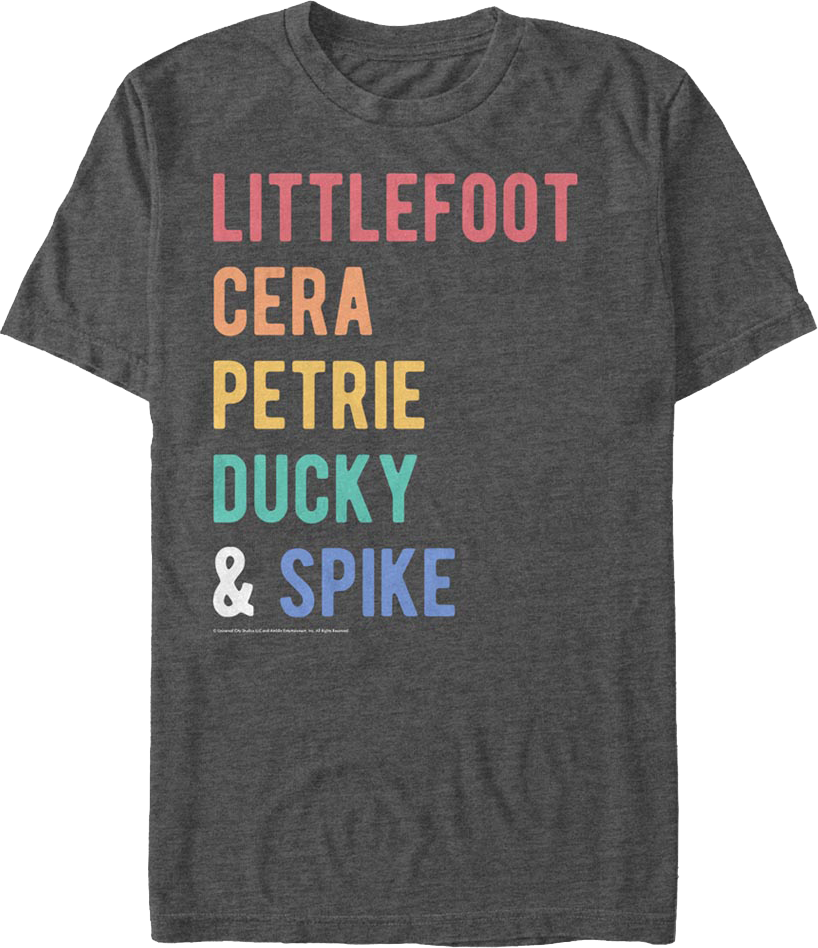 This Land Before Time t-shirt features the names of the animated dinosaurs Littlefoot, Cera, Petrie, Ducky, and Spike.