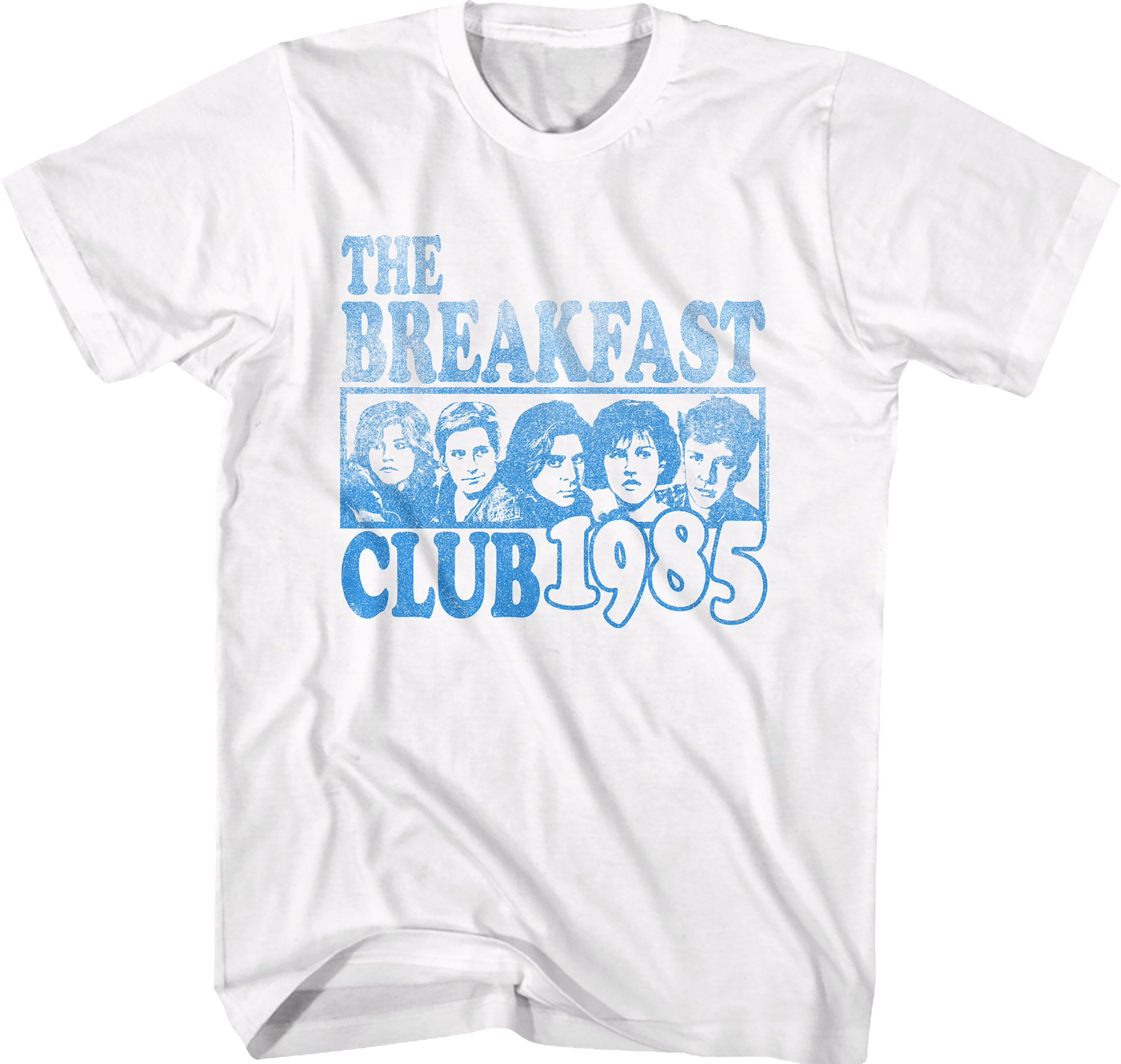 This Breakfast Club t-shirt shows students from Shermer High School's class of 1985. The shirt shows "the basket case" Allison Reynolds, "the jock" Andrew Clark, "the criminal" John Bender, "the princess" Claire Standish, and "the brain" Brian Johnson.