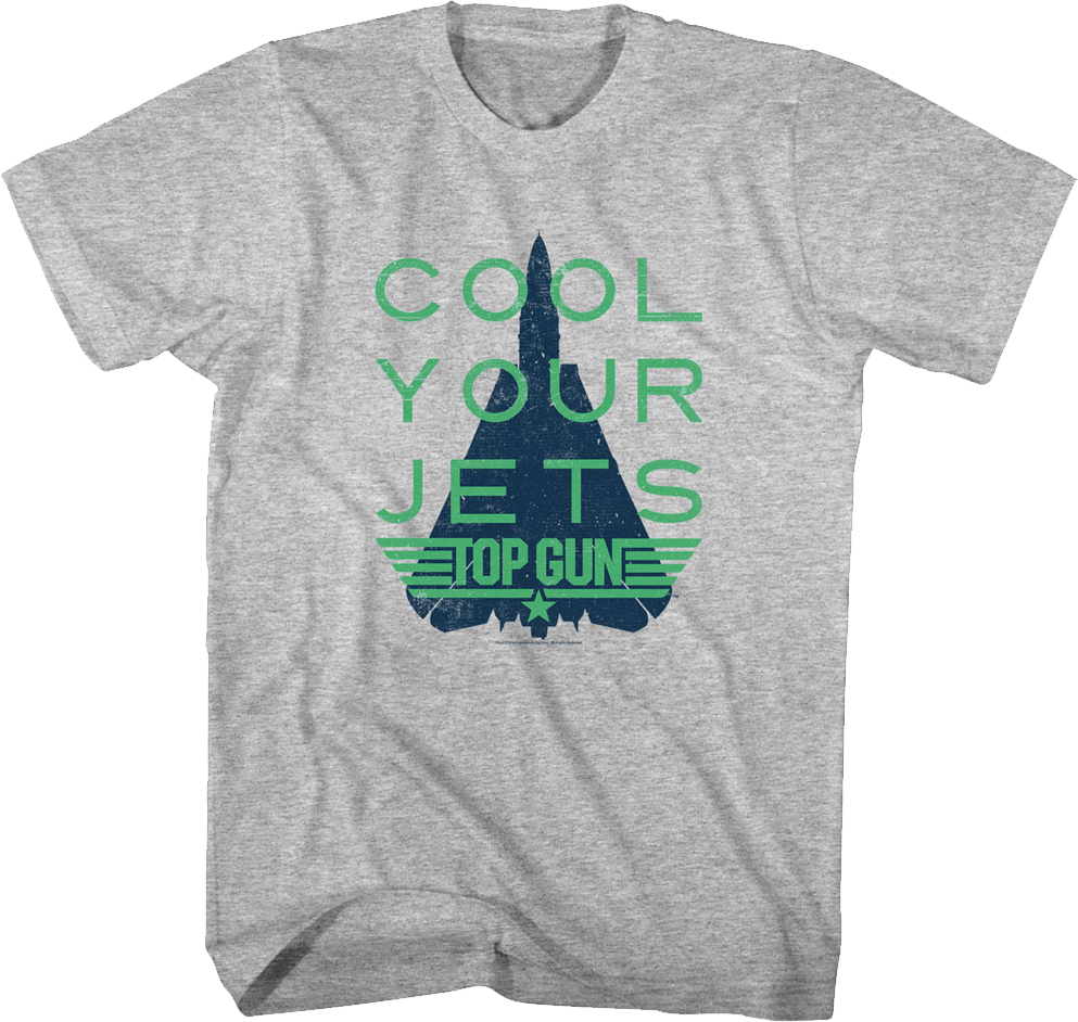 This Top Gun t-shirt shows a silhouette of a F-14A Tomcat. The shirt reads Cool Your Jets.