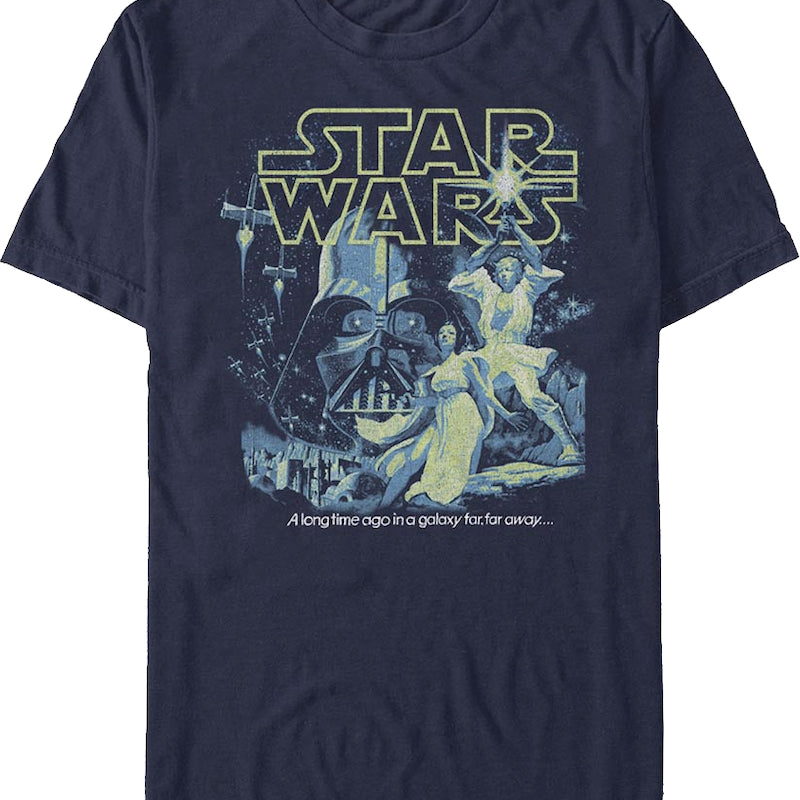 This Star Wars t-shirt shows Darth Vader, Luke Skywalker, and Princess Leia on a vintage poster for the original 1977 Star Wars movie.