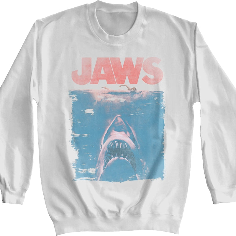 For any fan of Steven Spielberg's terrifying 1975 classic, this Distressed Movie Poster Jaws Sweatshirt is a must have!