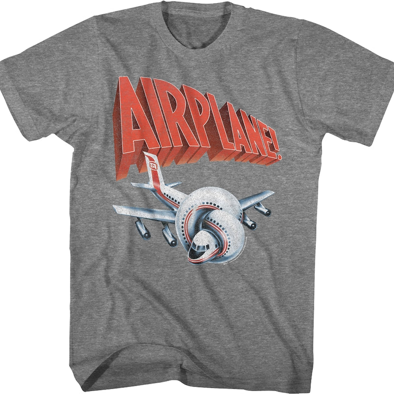 This Airplane! t-shirt features the twisted plane that appeared on the poster for the 1980 classic starring Robert Hays, Julie Hagerty, Leslie Nielsen, Peter Graves, Lloyd Bridges, Kareem Abdul-Jabbar, and Robert Stack.