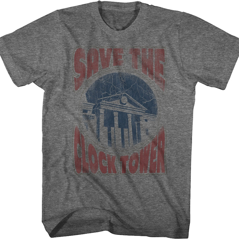 This Back To The Future t-shirt shows the clock tower at the Hill Valley Courthouse being struck by lightning. The shirt reads Save The Clock Tower.