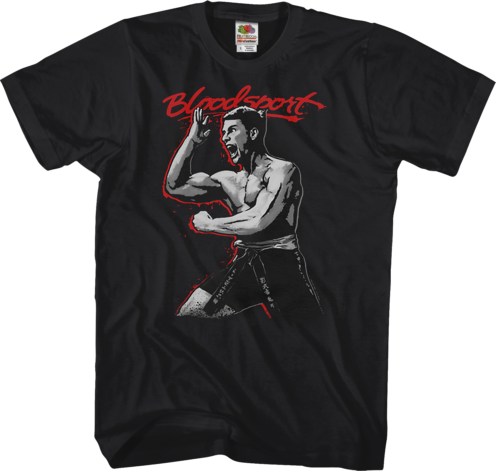 This Bloodsport t-shirt features the 1988 movie's logo and an image of Frank Dux ready to fight in the Kumite tournament. The image of Dux is surrounded by dripping and splattered blood.