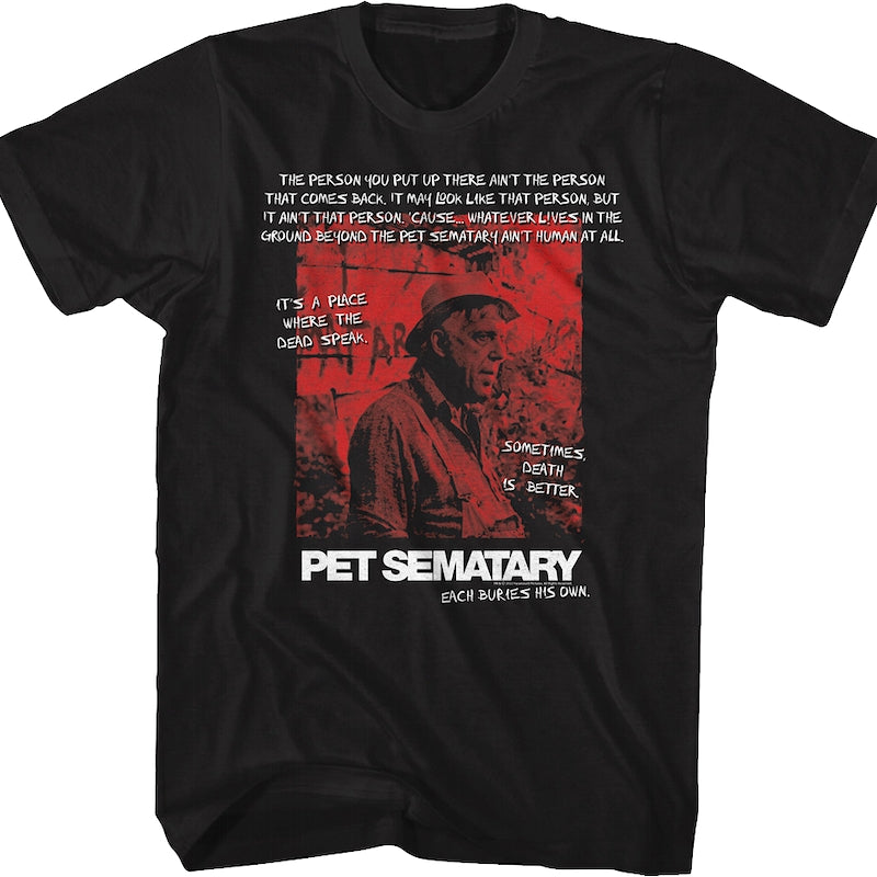 This Pet Sematary t-shirt features an image of Fred Gwynne as Jud Crandall. The shirt includes warning that once you bury a person in the pet sematary, they come back. They may look like that person, but it ain't that person.
