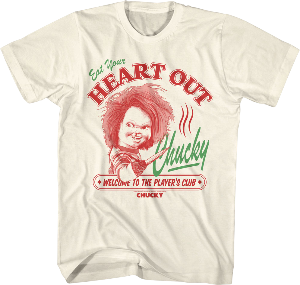 This Child's Play t-shirt features an image of the Good Guy doll Chucky with a knife replacing his hand. The shirt reads "Eat Your Heart Out Chucky. Welcome To The Player's Club."