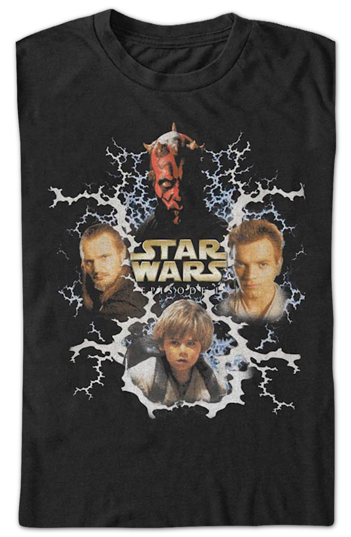 This Star Wars t-shirt features images of Darth Maul, Obi-Wan Kenobi, Anakin Skywalker, and Qui-Gon Jinn. These characters appeared in the 1999 blockbuster Star Wars: Episode I The Phantom Menace.