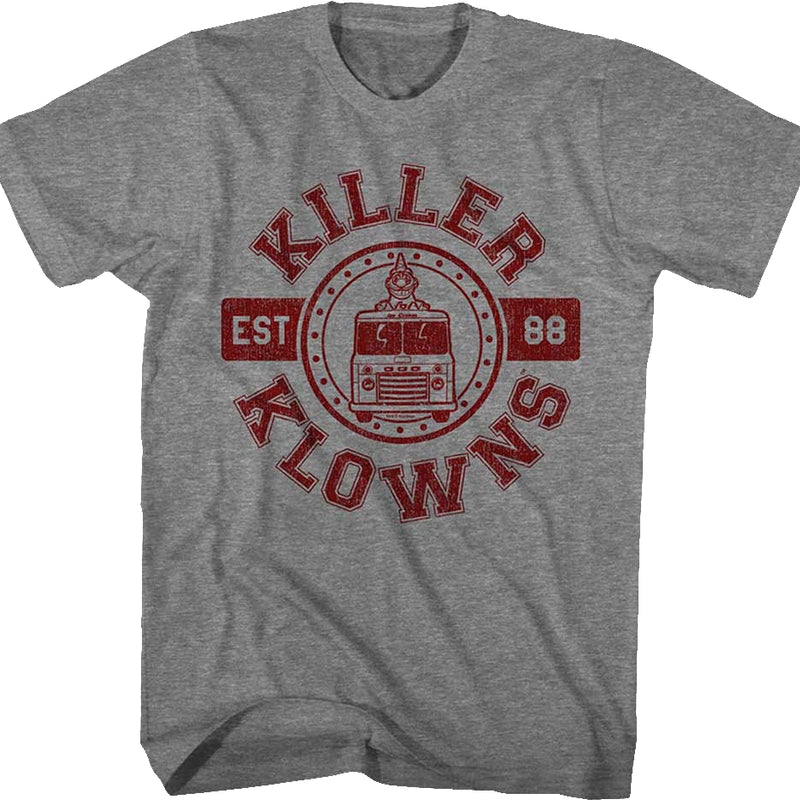 This Killer Klowns From Outer Space t-shirt shows Klownzilla collegiate sports design that reads Killer Klowns Est. 88.