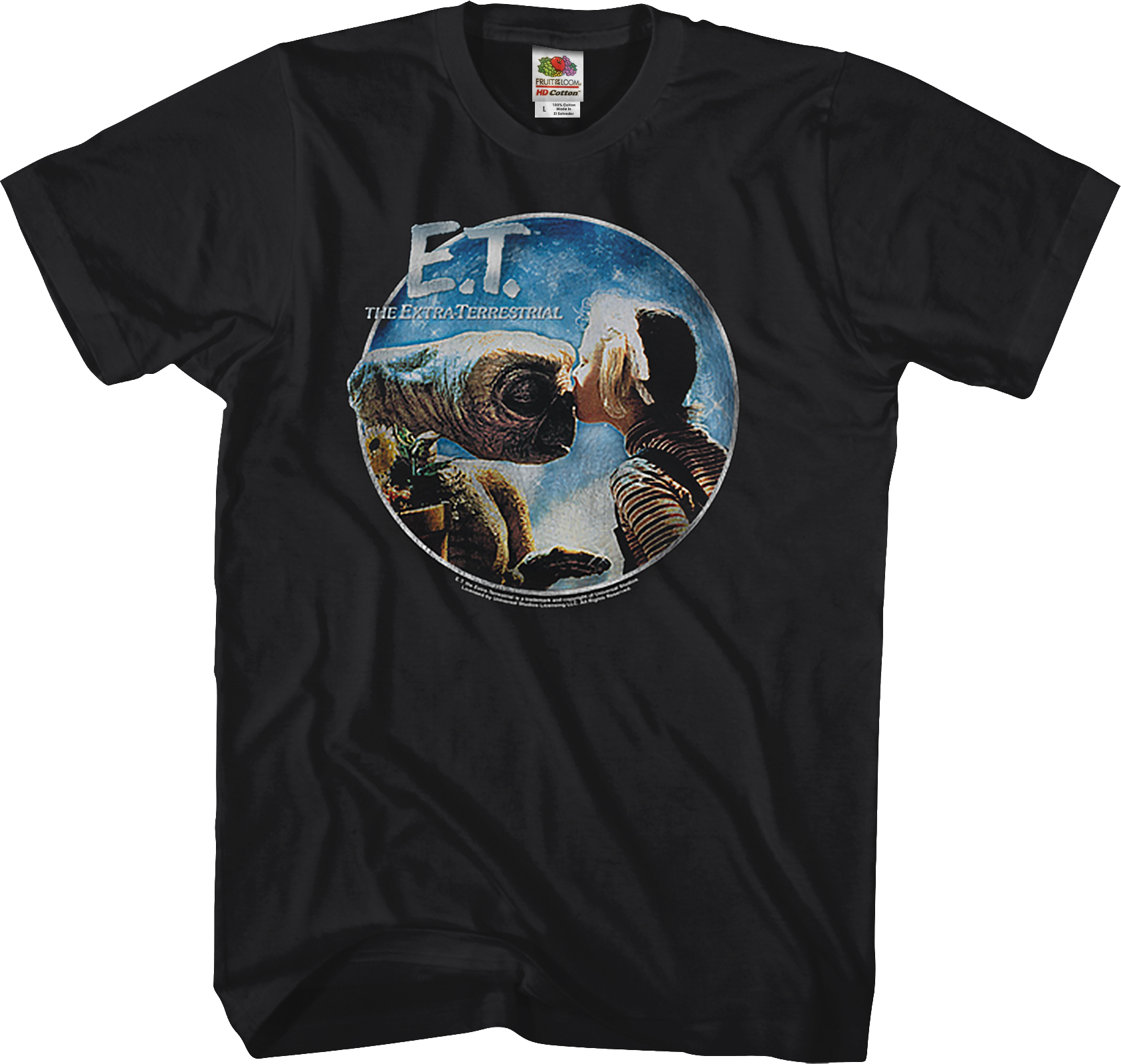 This E. T. shirt shows Gertie, who was initially afraid of E. T. showing her love for the extra terrestrial with a kiss. This t-shirt captures one of the many emotional images from E. T., making this the perfect shirt for any fan Steven Spielberg's 1982 classic. Show your love for E. T. with this Gertie Kiss t-shirt.