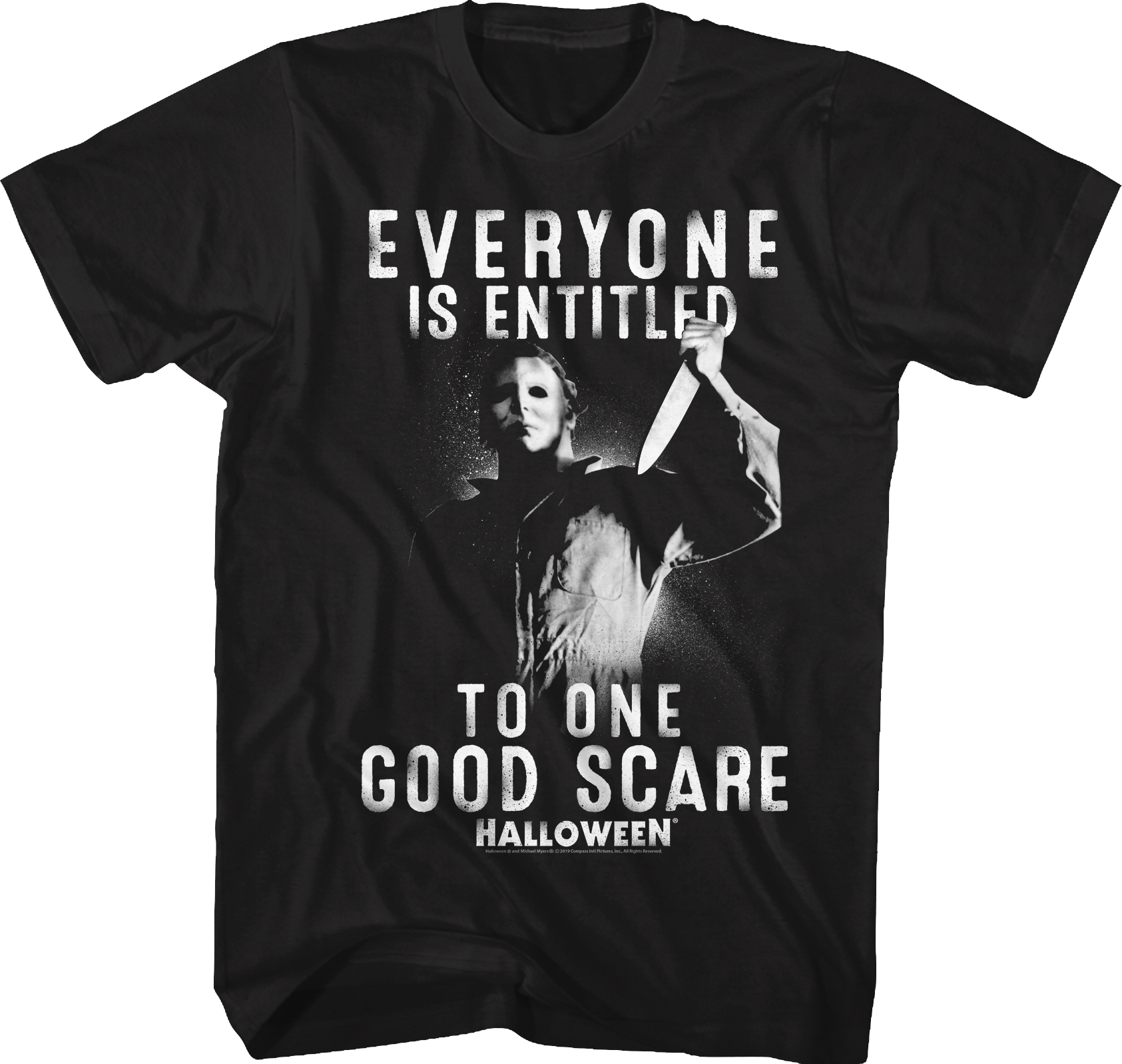 This Everyone Is Entitled To One Good Scare Halloween T-Shirt shows Michael Myers holding his butcher knife. The shirt reads, "Everyone is entitled to one good scare. One of the most popular quotes from John Carpenter's classic horror movie was delivered by Sheriff Brackett. When Laurie Strode bumped into him and jumped, Brackett said the quote that appears on this t-shirt. Poor Laurie was in for more than just one scare as Michael Myers stalked her on Halloween night.
