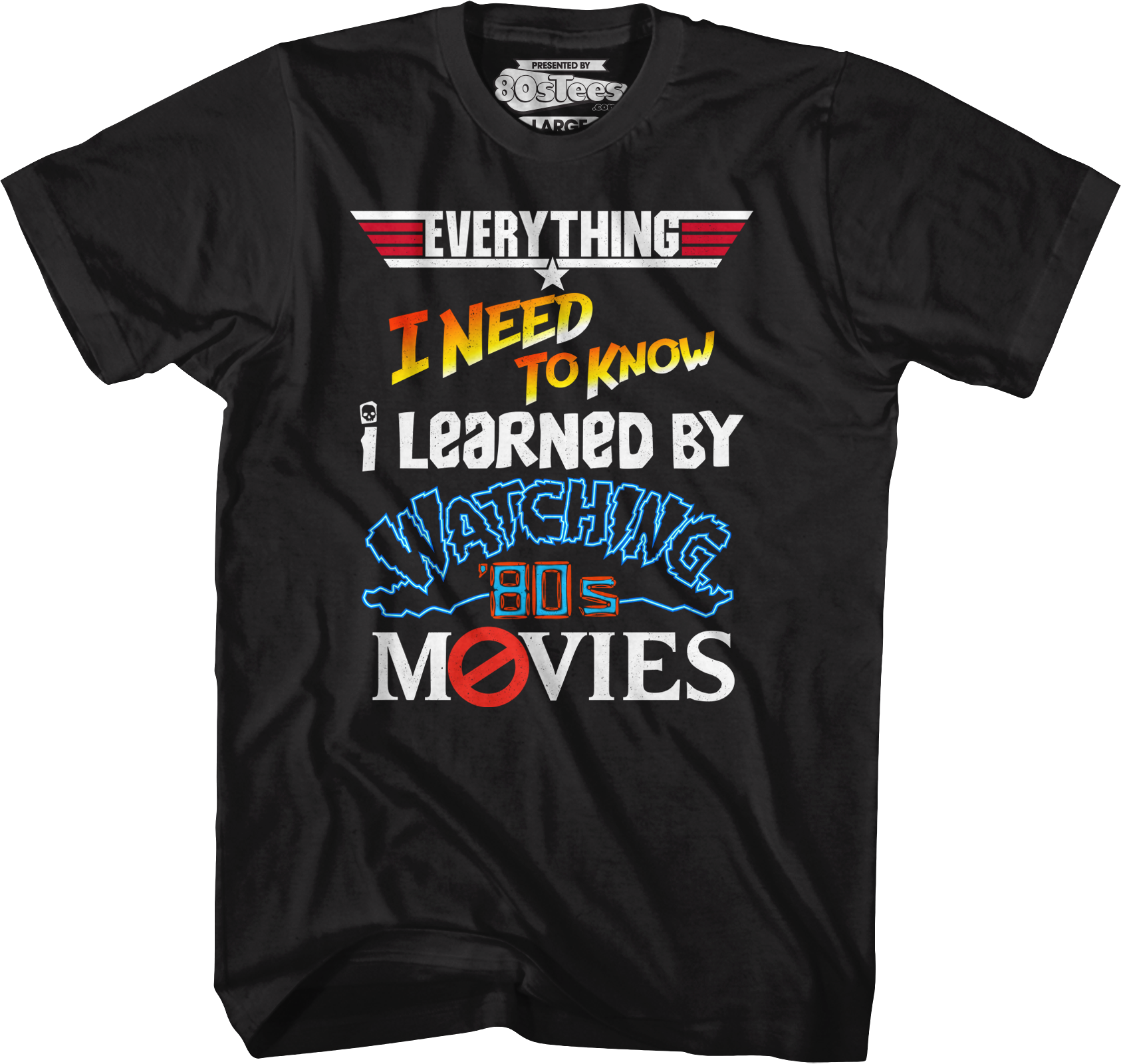 For any fan of the greatest movies from the greatest decade, this 80sTees.com exclusive Everything I Need To Know 80s Movies T-Shirt is a must have!
