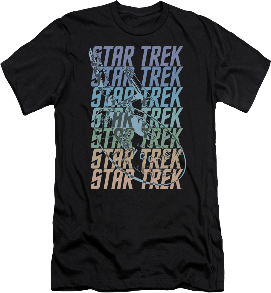This t-shirt shows the Star Trek logo overlapping the USS Enterprise.