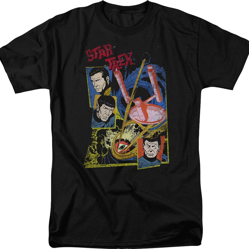 The USS Enterprise carried Captain James T. Kirk, Spock, and Leonard McCoy on a five year mission to explore strange new worlds, to seek out new life and new civilizations, and to boldly go where no men had gone before. With unforgettable explorations, Star Trek became one of the most popular television series of all time. Let everyone know that you are a fan with this Eye Of The Storm Star Trek T-Shirt!