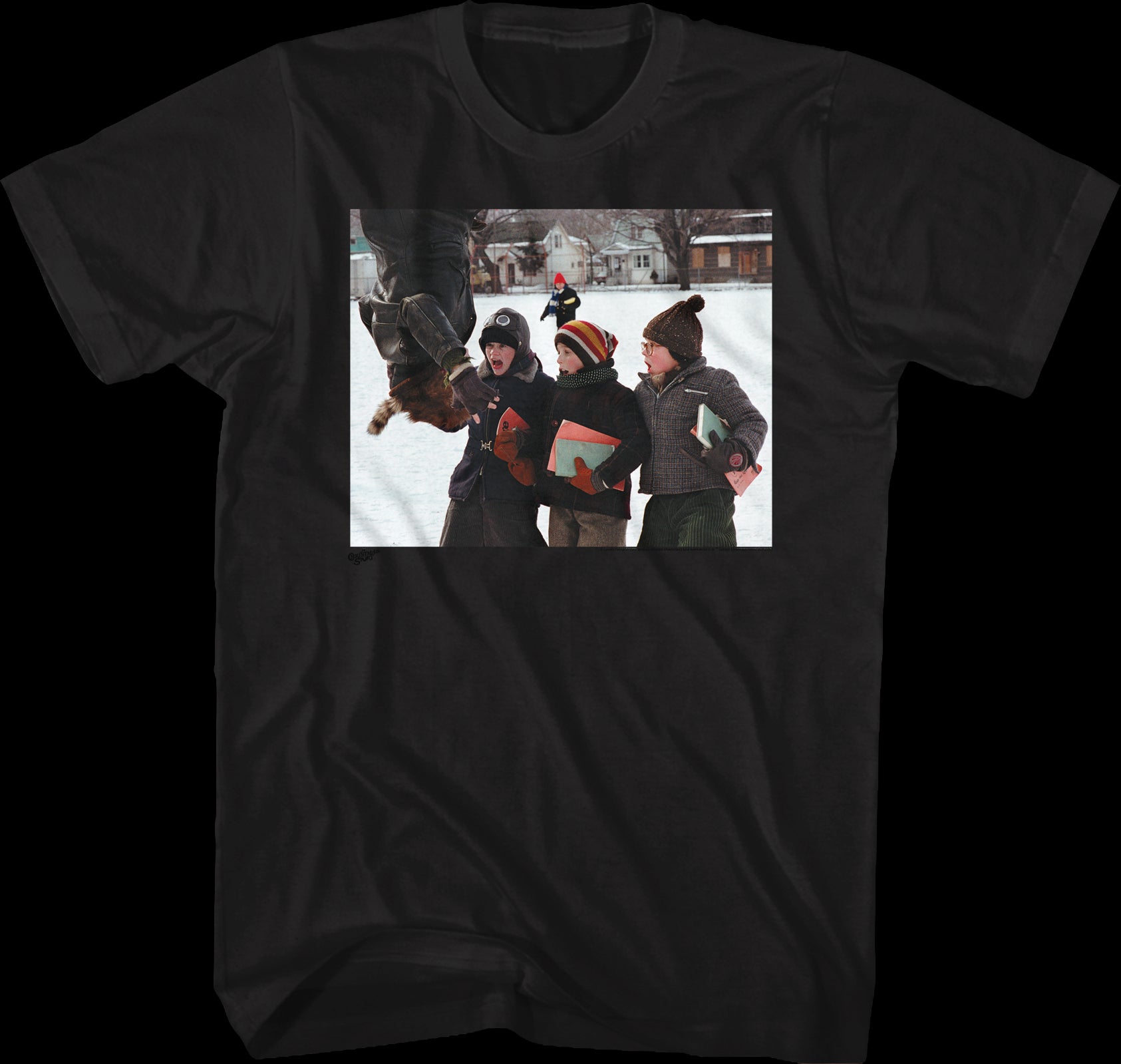 This Christmas Story t-shirt features an image of Scut Farkus hanging upside down to scare Flick, Schwartz and Ralphie.