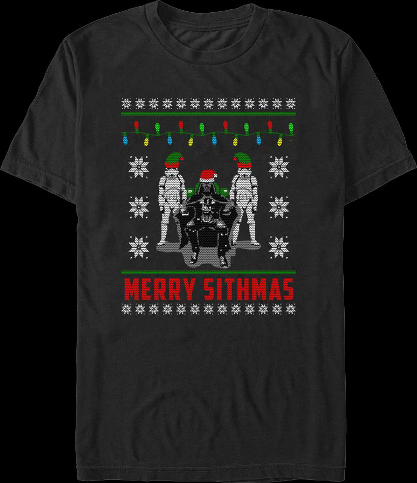 This Star Wars t-shirt shows Darth Vader wearing a Santa Claus hat, and Stormtroopers wearing elf hats in an image that is designed to look like an ugly knit Christmas sweater. The image includes Christmas lights and snowflakes.