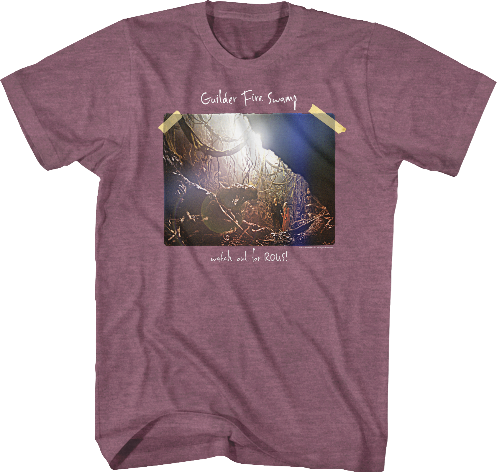 This Princess Bride t-shirt is designed to look like a photograph is taped to the shirt. The photograph shows Westley and Buttercup in the Fire Swamp. The shirt reads Guilder Fire Swamp, watch out for ROUS!