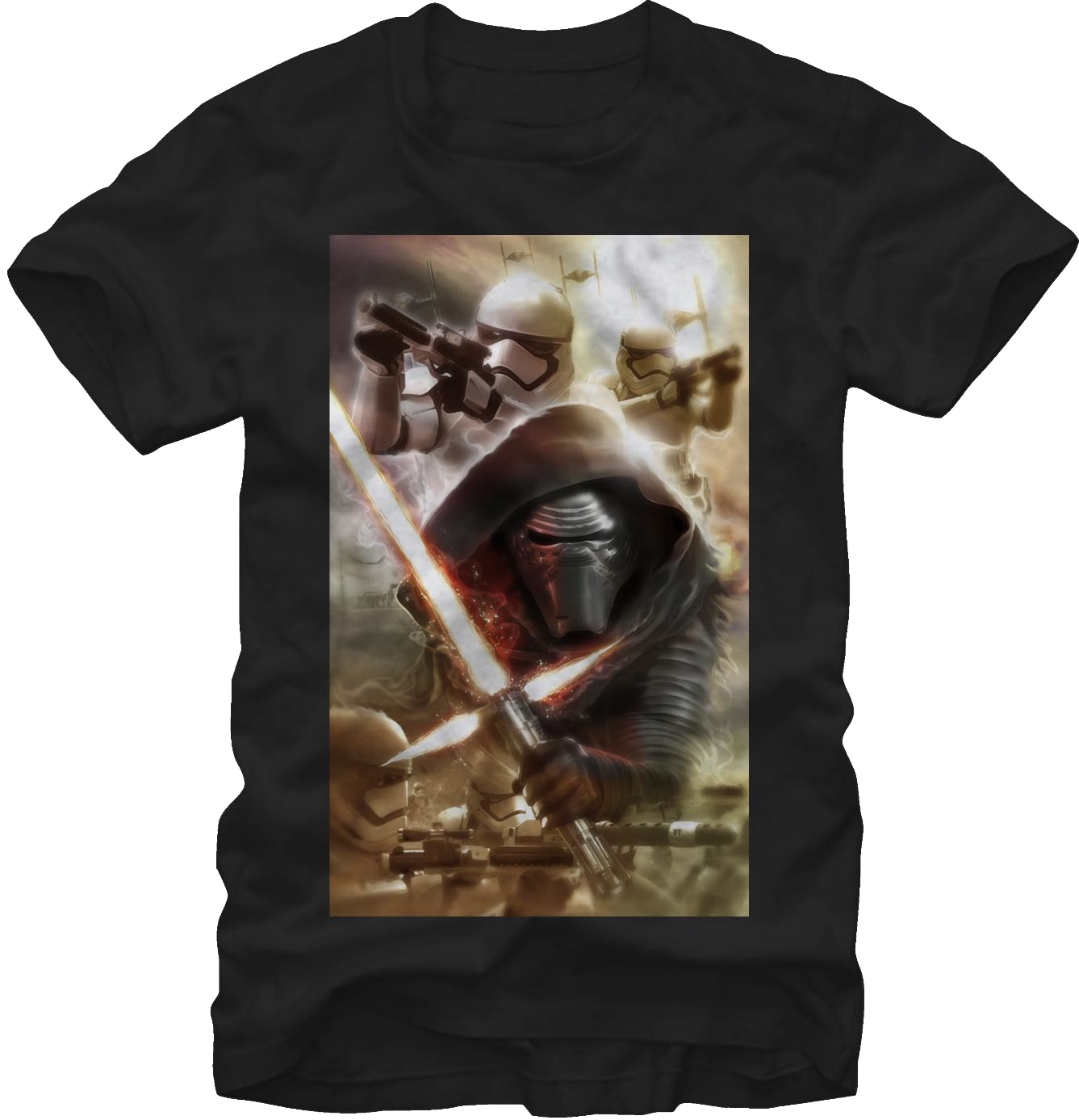 This First Order Attack Star Wars T-Shirt features an image of Kylo Ren with his claymore style lightsaber and First Order Stormtroopers battling with their blaster rifles. The cloudy background shows TIE fighters in the distance. Kylo Ren is associated with the First Order, a military junta born from the remnants of the Galactic Empire.