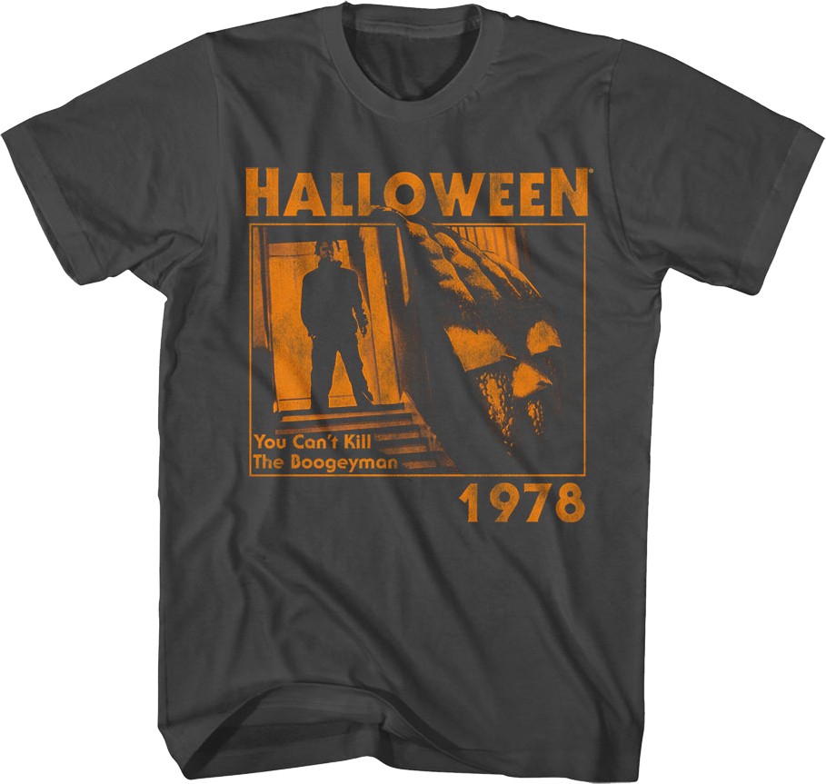 The front of this Halloween t-shirt shows Michael Myers standing at the top of a staircase and the Jack-o'-Lantern from the movie's poster. The shirt includes the classic quote "You can't kill the boogeyman." The back of the shirt shows the Halloween logo.