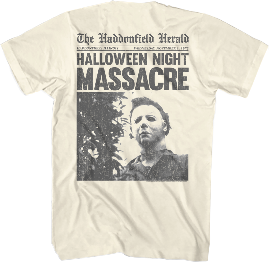 The front of this Halloween t-shirt features the move's logo. The back of the shirt shows Michael Myers appearing in a headline for The Haddonfield Herald newspaper that reads "Halloween Night Massacre."