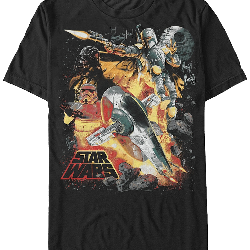 This shirt shows a Stormtrooper, Darth Vader and Boba Fett. The shirt also shows TIE Fighters, the Death Star, a meteor shower, and Bobba Fett's attack craft Slave I.