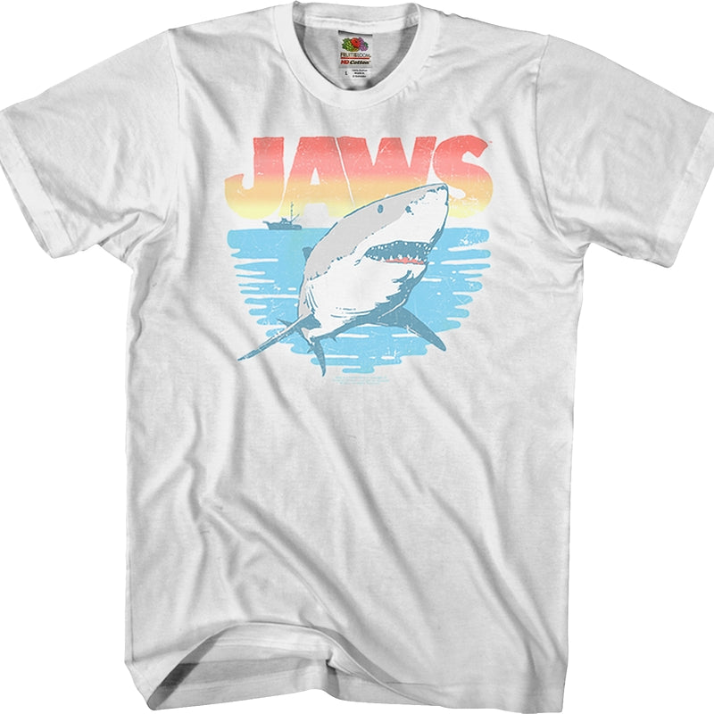 This Great White Jaws T-Shirt shows a pastel picture of the giant shark with the Orca fishing boat and the movie's logo in the background. In the 1975 Steven Spielberg horror classic, the residents of Amity Island were terrorized by the huge great white shark and audiences would think twice about getting into the water for years to come. The movie was based on a book by Peter Benchley, who makes a cameo as a news reporter on the beach.
