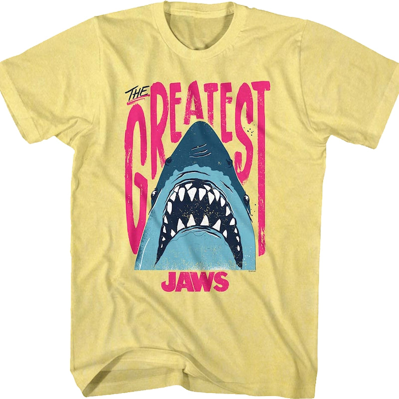 There are many great white sharks, but there is only one "greatest" white shark, and that is the one that was feeding on swimmers in the waters of the tourist town of Amity Island. Police chief Martin Brody, Ichthyologist Matt Hooper, and ship captain Quint teamed up to capture the killer beast in one of the most thrilling adventures in cinematic history. Let everyone know you are a fan of Steven Spielberg's 1975 classic with this Greatest Jaws T-Shirt!