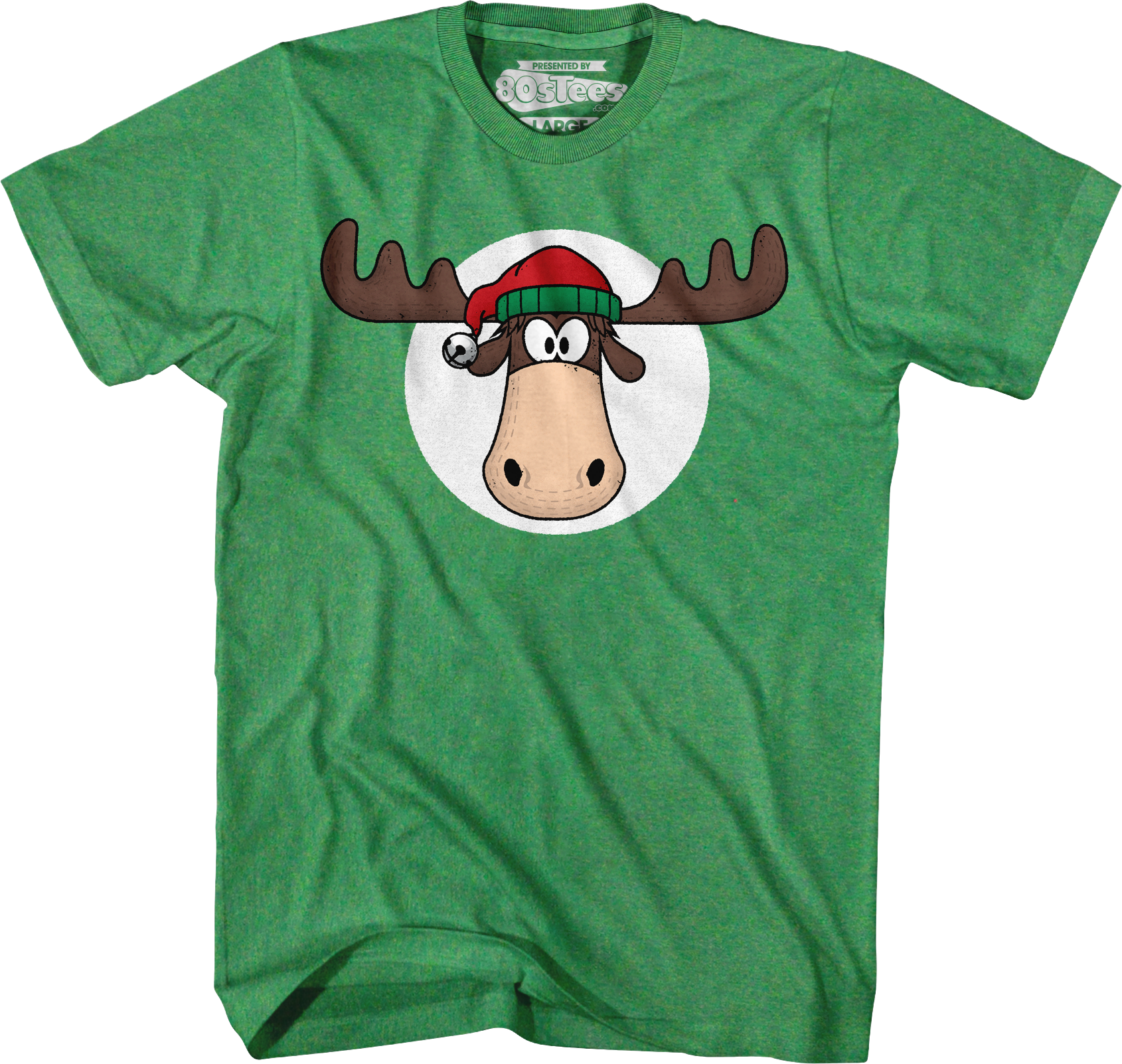 This 80sTees.com exclusive Christmas Vacation t-shirt shows Marty Moose celebrating the holiday by wearing a Santa Claus hat.