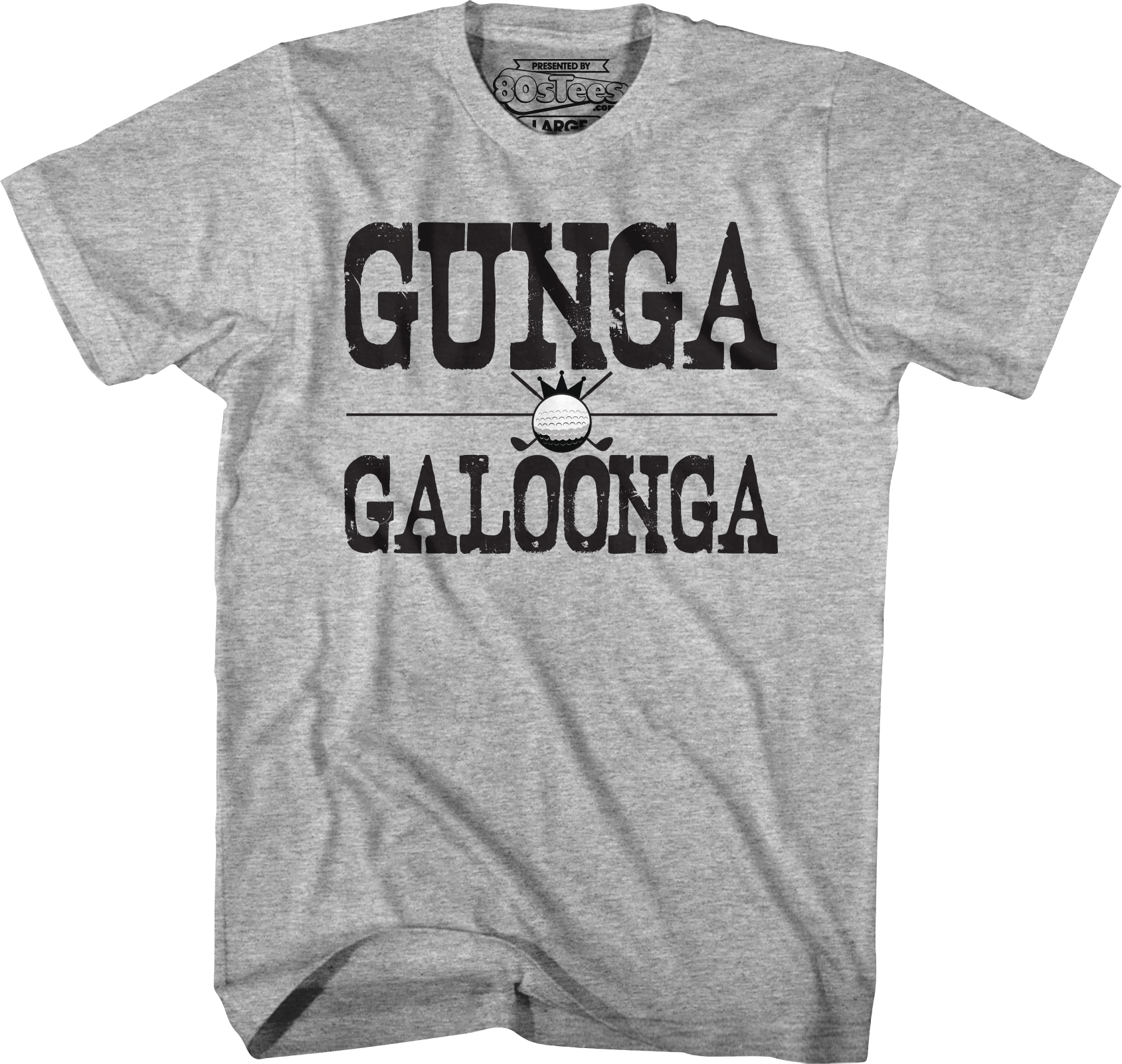 This 80sTees.com exclusive Caddyshack t-shirt shows a golf ball and crossed golf clubs logo. The shirt includes Carl Spackler's quote Gunga Galoonga.