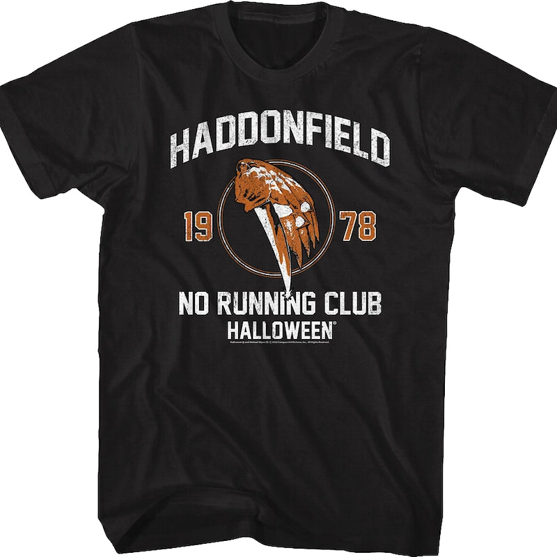 This Halloween t-shirt features the logo for the social club that encourages no running from Michael Myers. They know that no matter how slowly Michael walks, he will always catch up to his victims, so there is no use in running anyway.