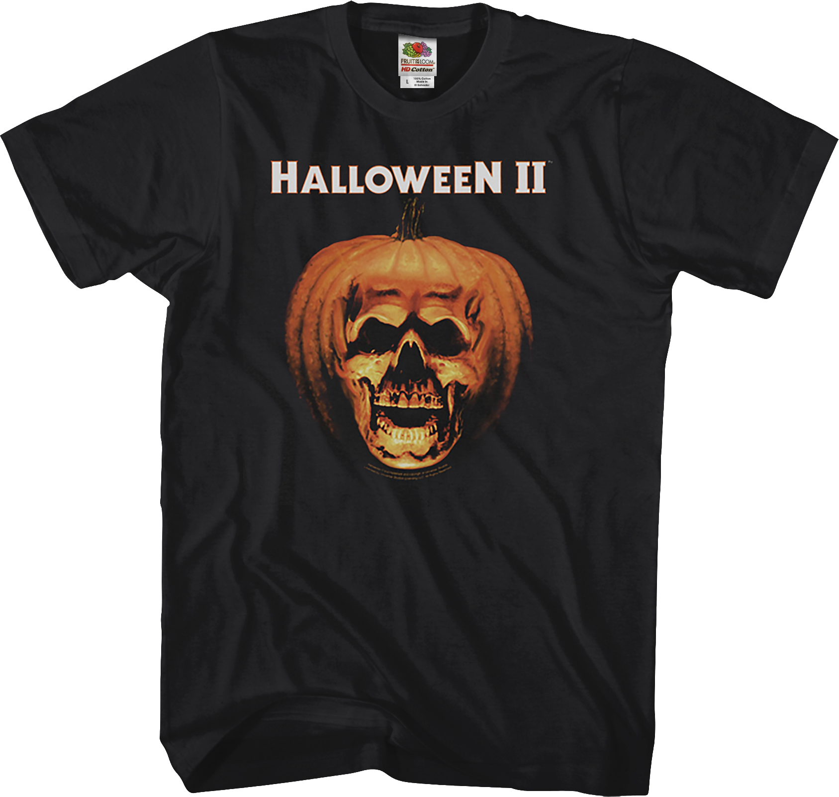 In October 1981, American theaters were shocked again by the horror of Michael Myers when Halloween II, the sequel to the 1978 John Carpenter horror film was released into theaters. This shirt features the film logo and jack-o-lantern/human skull hybrid which graced the original movie poster. Jamie got this shirt because he still has a crush on Jamie Lee Curtis as Laurie Strode.