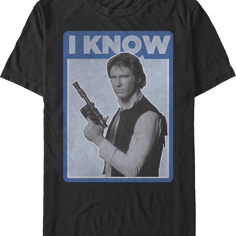 When Han Solo first met Princess Leia, he didn't know if he wanted to kill her or was beginning to like her. By the time Han was to be frozen in carbonite, Princess Leia confessed her love for Solo. This Star Wars t-shirt features an image of Han Solo with his blaster pistol and his response to Princess Leia, "I Know."
