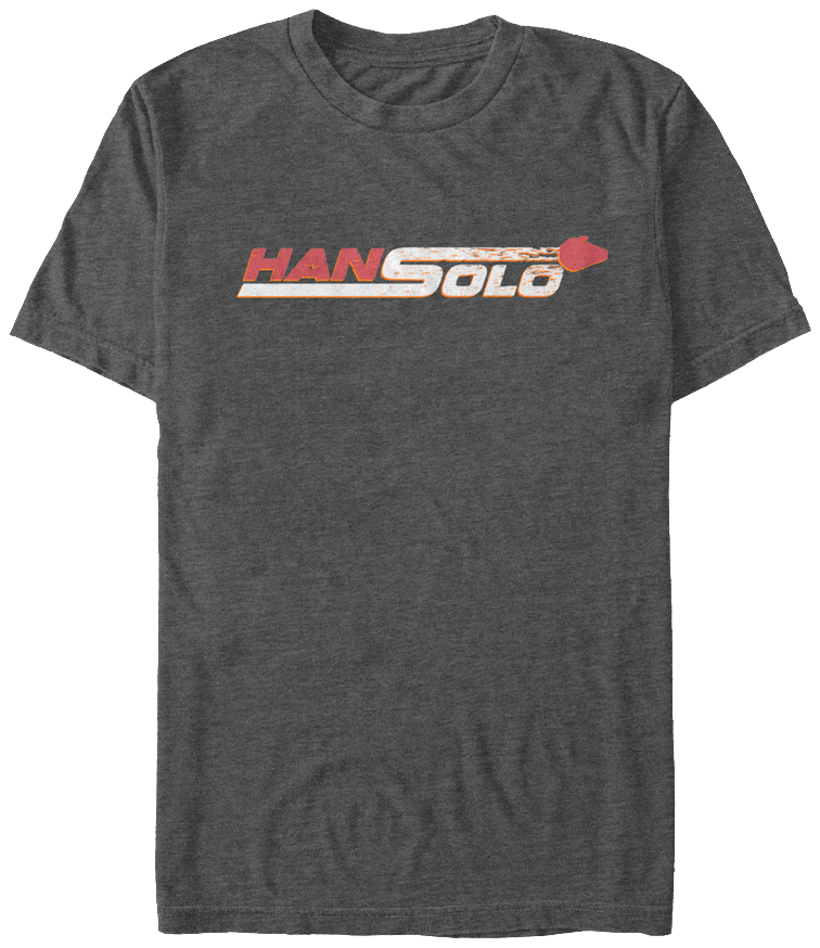 This Han Solo Star Wars T-Shirt shows the infamous smuggler's name with the Millennium Falcon's trail forming the "S". The movie Solo: A Star Wars Story tells the story of the character's young life and how he came upon his would-be co-pilot and his notorious ship. Han Solo has been a favorite character since his first appearance in 1977.