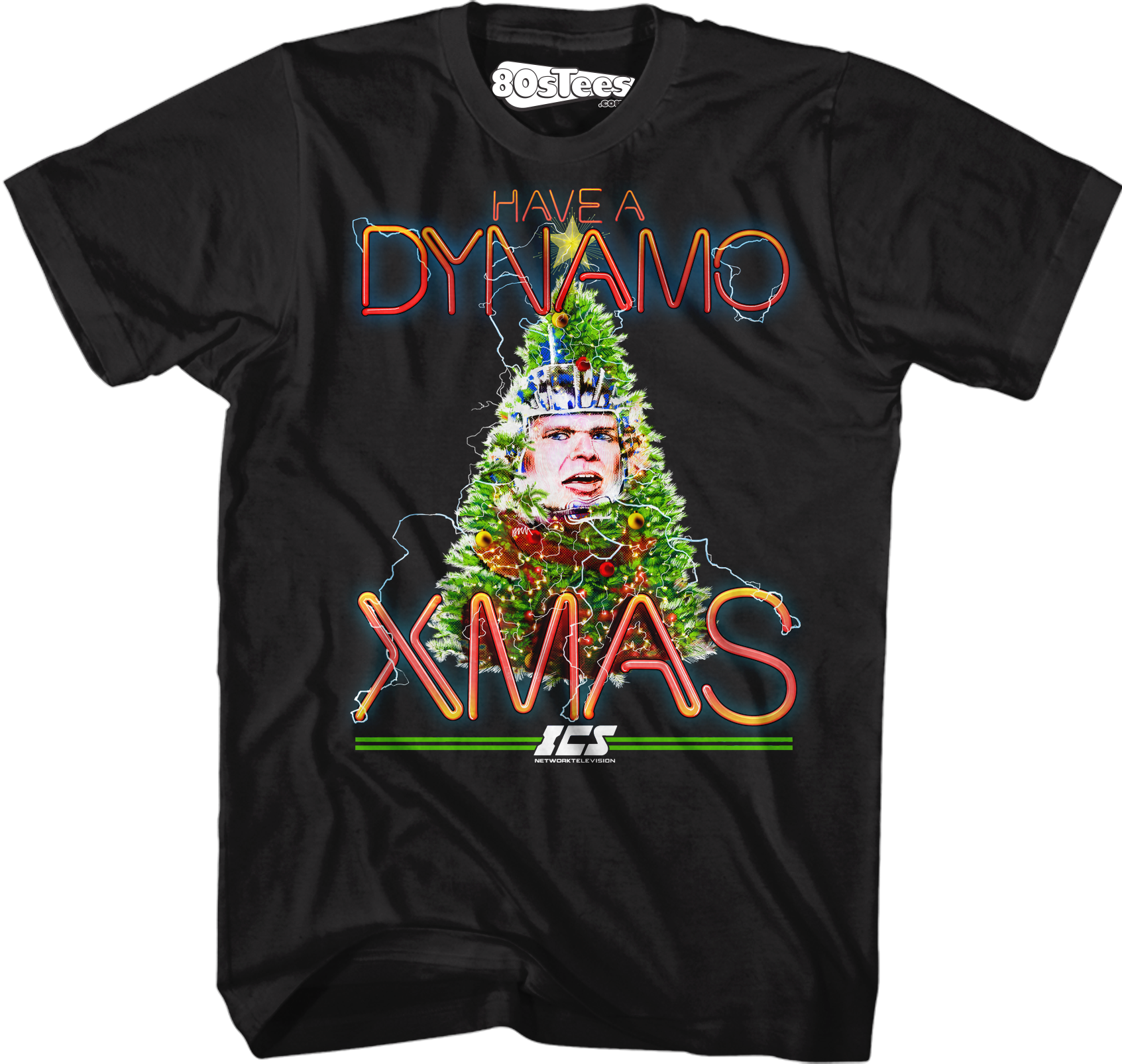 This 80sTees.com exclusive Running Man t-shirt features an image of the Stalker named Dynamo in a Christmas tree. The shirt reads Have A Dynamo Xmas.