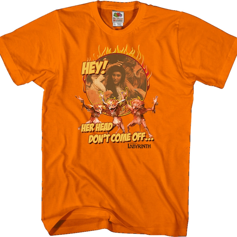 This Labyrinth t-shirt shows three Fierys and Sarah. The shirt reads Hey! Her Head Don't Come Off...