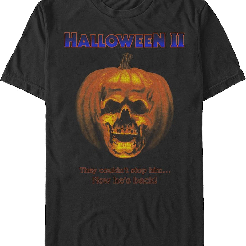 This Halloween t-shirt shows the skull in a pumpkin that appeared in the opening credits of the 1981 movie Halloween II. The shirt includes the movie's tagline, "They couldn't stop him...Now, he's back!"