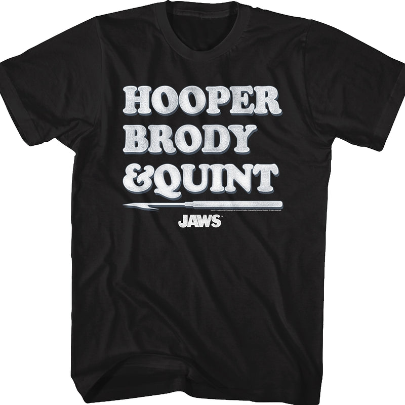 In Jaws, a rogue great white shark terrorized Amity Island, and the only three men that could stop it were Matt Hooper, Chief Brody and Quint. The three men's names appear on this Jaws t-shirt.