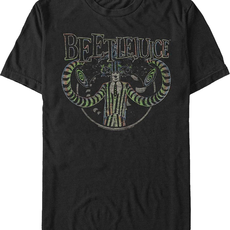 This Beetlejuice t-shirt shows "the ghost with the most" with a circus headpiece and elongated arms.