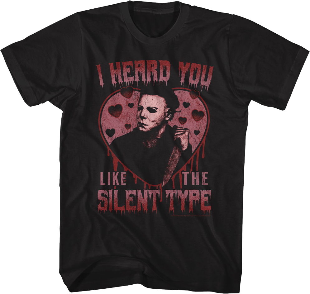 This Halloween t-shirt shows Michael Myers holding a butcher knife in a bloody heart. The shirt reads I Heard You Like The Silent Type.
