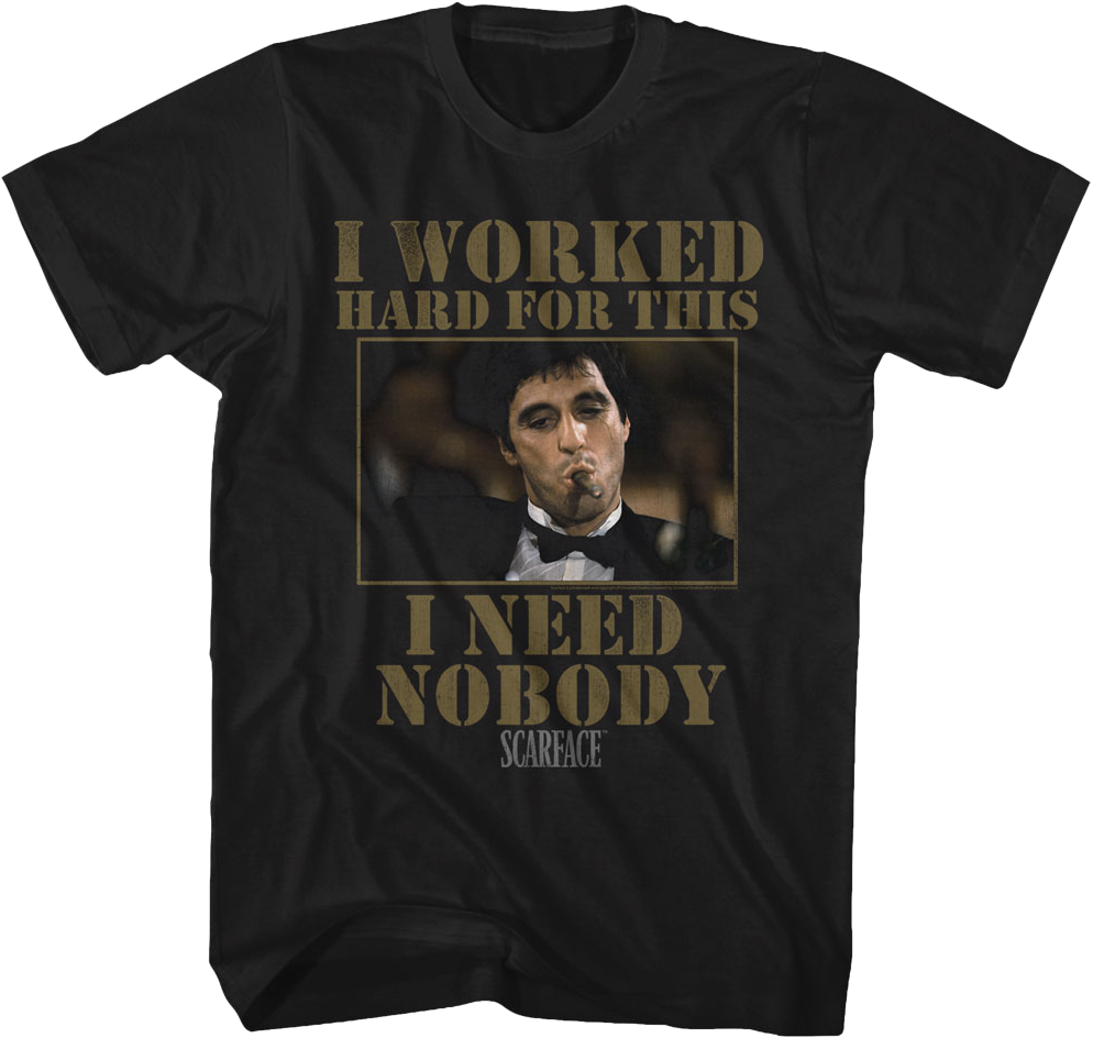 This I Need Nobody Scarface T-Shirt features a photo of Al Pacino wearing a tuxedo and smoking a cigar. The shirt reads, "I worked hard for this. I need nobody." In Scarface, Tony Montana was a Cuban refugee who came from nothing and rose to become a violent and powerful drug kingpin. Tony Montana became one of the most iconic characters in cinematic history!