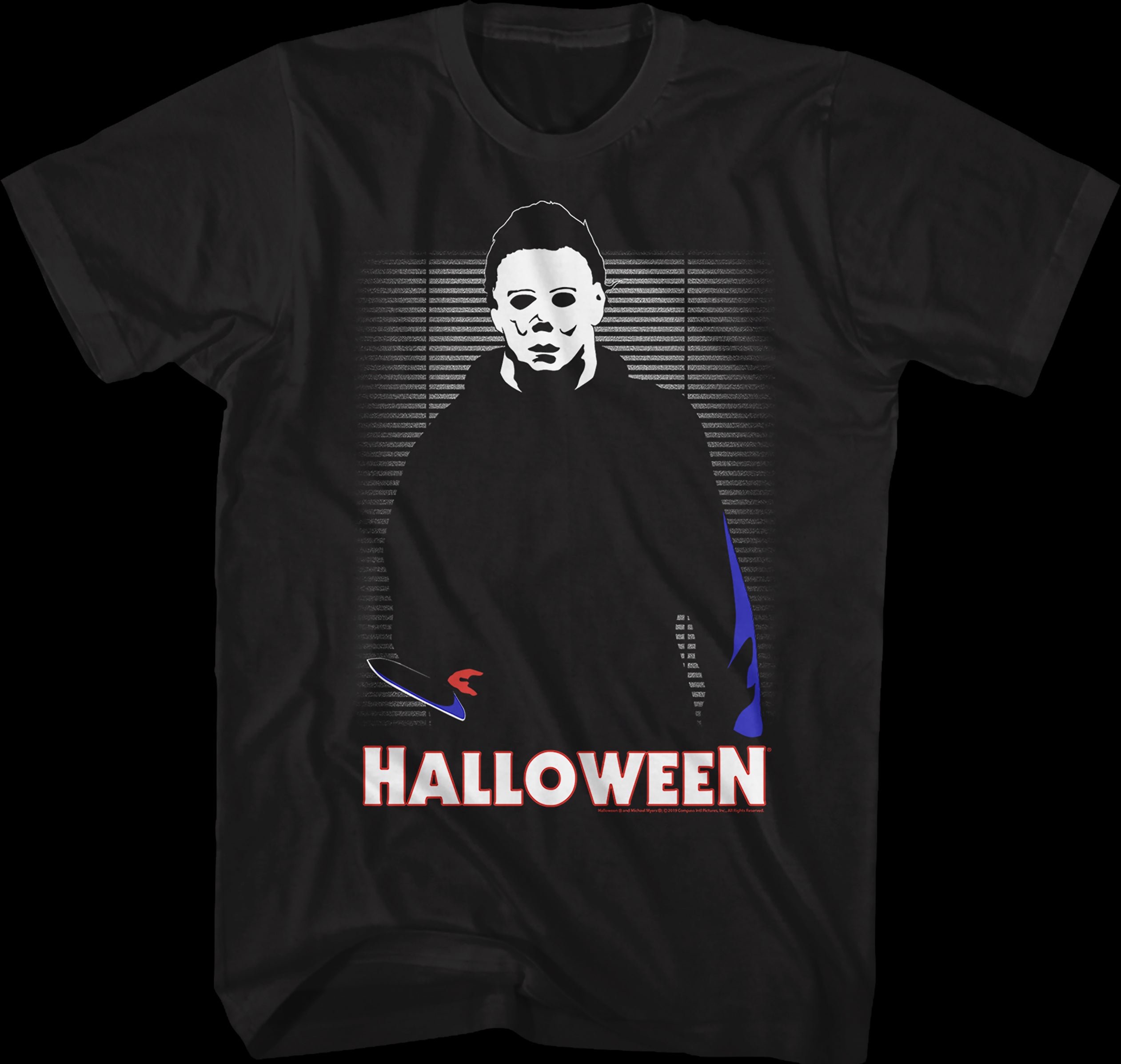 This Halloween t-shirt features an illustrated image of Michael Myers, with a knife in hand and a closet in the background.