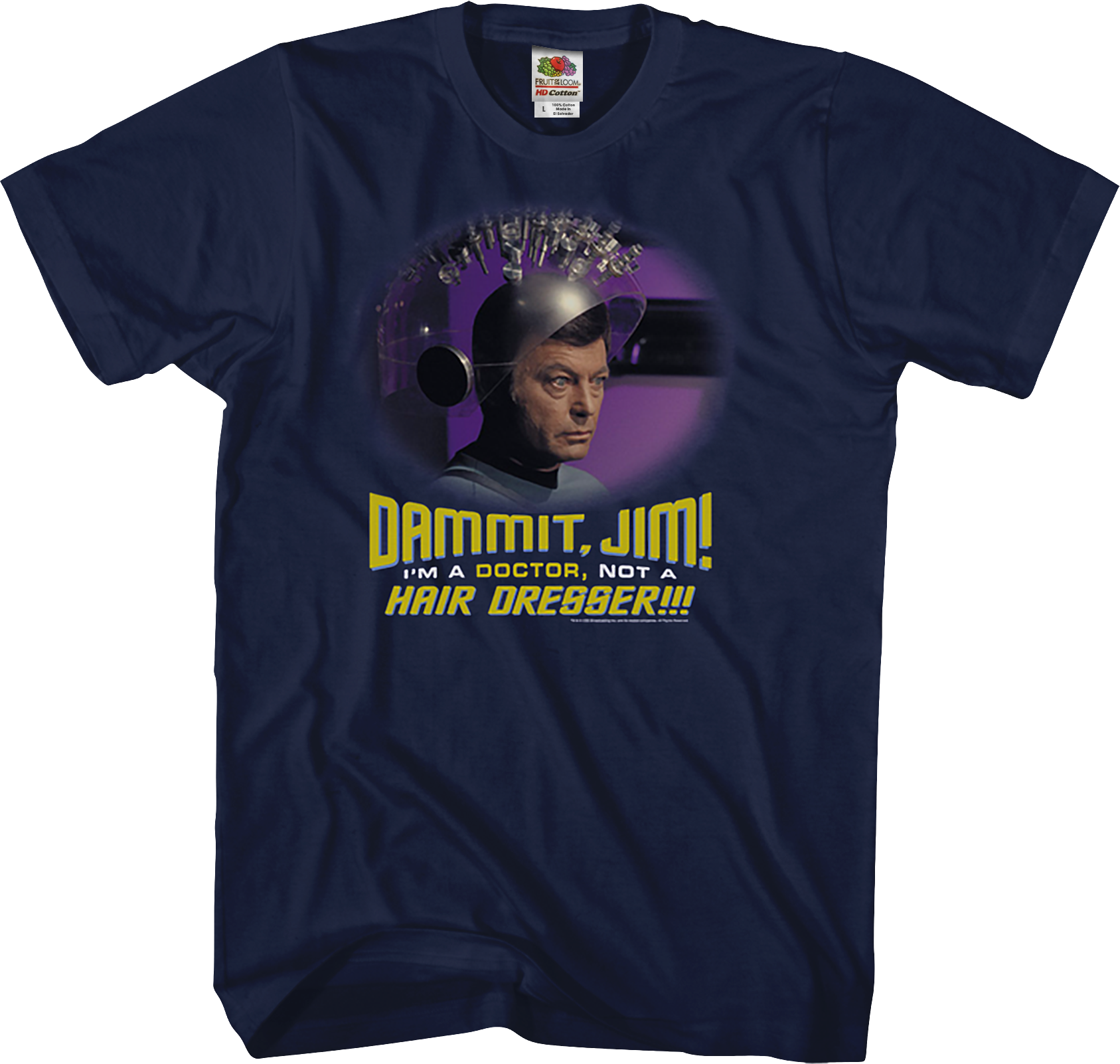 This Star Trek t-shirt reads Dammit, Jim! I'm A Doctor, Not A Hair Dresser!!! In the season three episode titled "Spock's Brain", a character named Kara was able to remove Spock's brain by placing on her head a device known as the "teacher". McCoy said that he has medical knowledge and should be able to use what he already knows and retain the knowledge that he would need to restore Spock's brain. This shirt shows an image of McCoy wearing the "teacher" on his head.