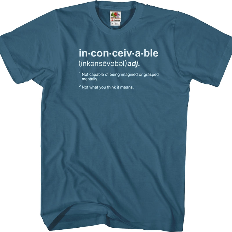 This Princess Bride t-shirt features the Florin dictionary definition of the word "inconceivable", which became a catch phrase for the Sicilian criminal mastermind Vizzini. Even though he was the one that fell for one of the classic blunders, Vizzini remains one of the most popular characters from the classic 1987 movie The Princess Bride. Now, you can show that you are a fan of Vizzini with this Inconceivable Definition Princess Bride t-shirt. Iocane not included.