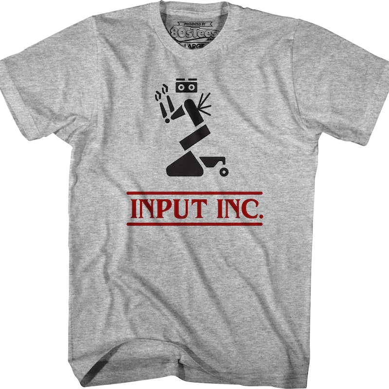 This 80sTees.com exclusive Short Circuit t-shirt features an image of Johnny 5 malfunctioning. The shirt reads Input Inc.