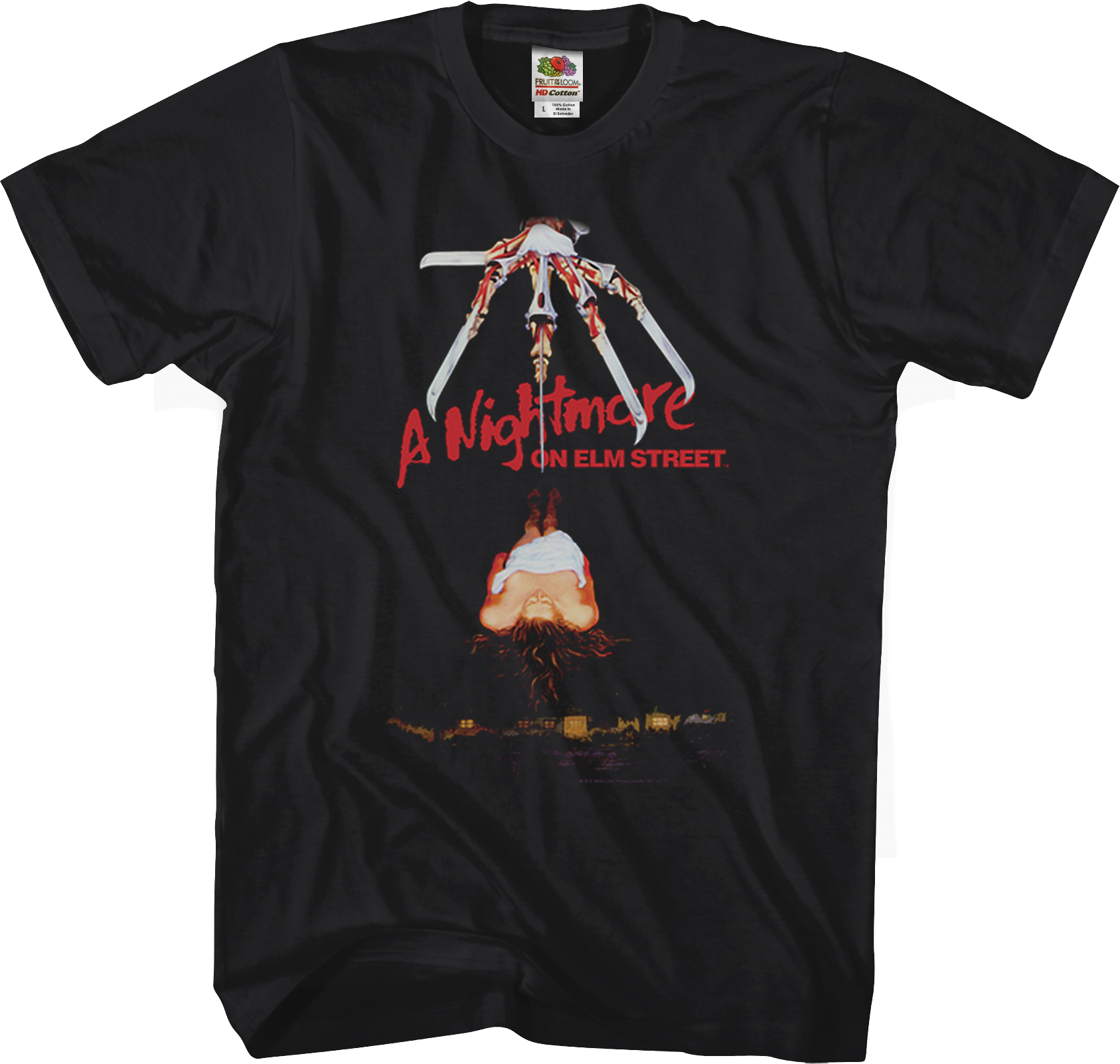 Internationally, the 1984 blockbuster Nightmare On Elm Street had several different poster artwork designs in different countries. The image that appears on this Nightmare On Elm Street t-shirt was the poster artwork seen in Italy.