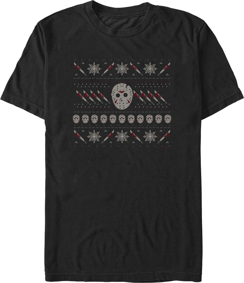 This Friday the 13th t-shirt is designed to look like an ugly knit Christmas sweater. The design includes snowflakes, Jason Voorhees' hockey masks, and machetes covered in the blood of Jason's victims.