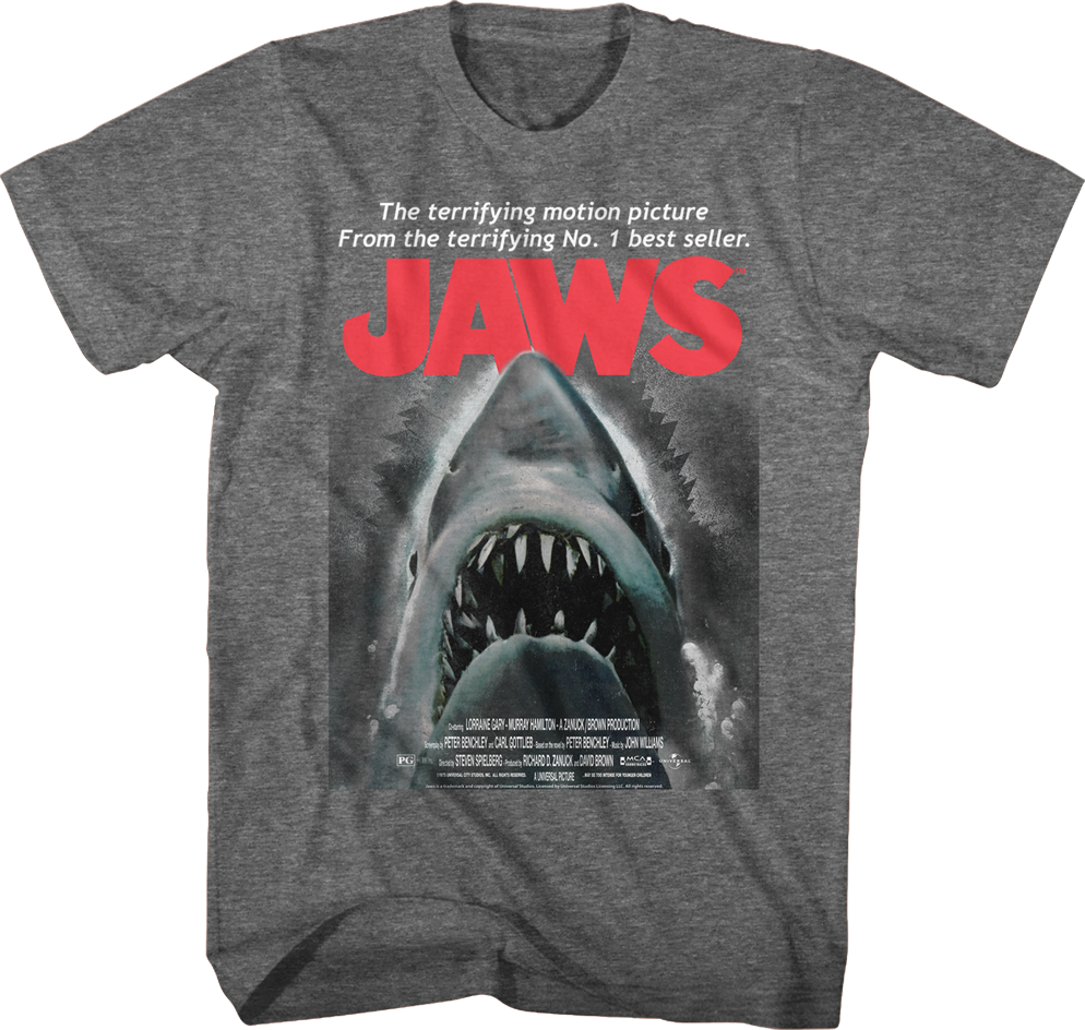 You yell barracuda, everybody says, "Huh? What?" You yell shark, everybody knows you're talking about a great Jaws shirt. This shirt features the poster artwork for the thrilling classic, Jaws. The shirt includes the tagline, The terrifying motion picture from the terrifying No. 1 best seller. Jaws has been included on countless top movie lists. Now, you can show that you are a fan of Jaws with this poster shirt.