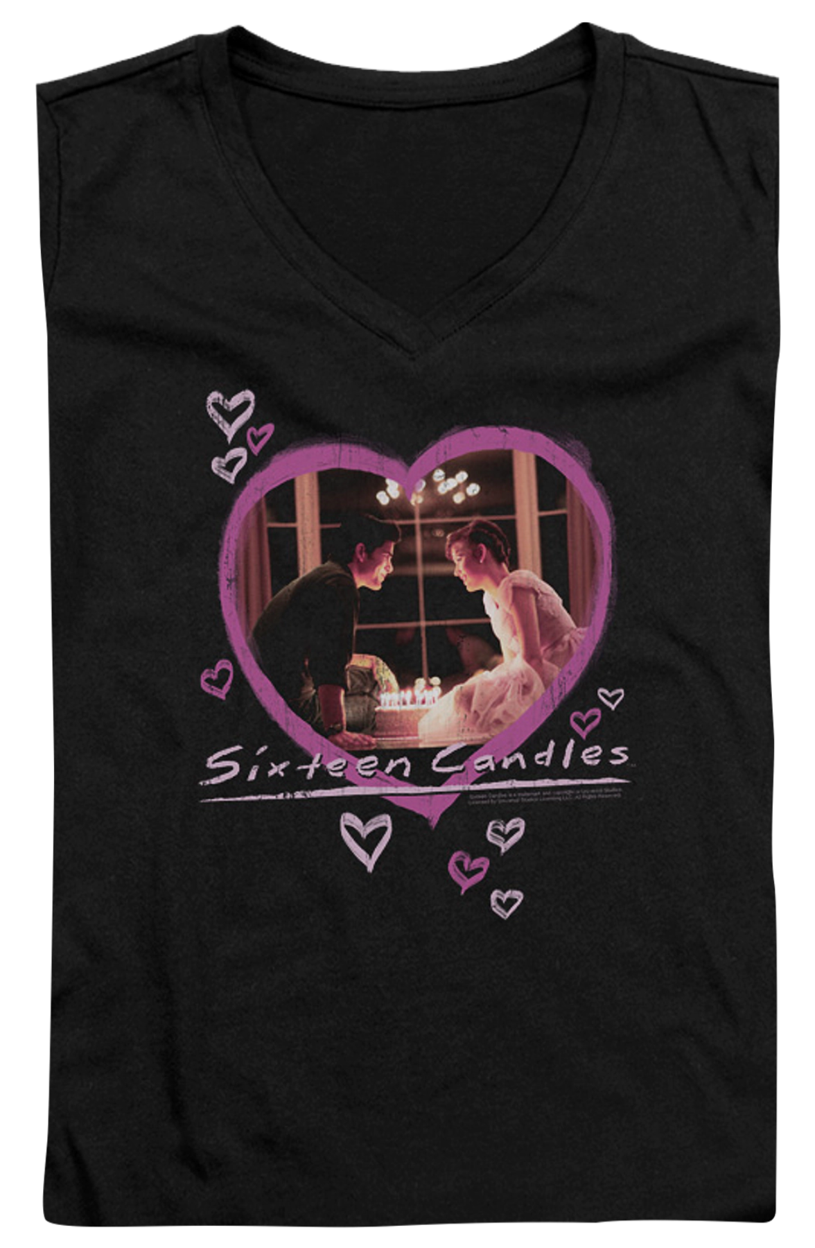 One of the most popular scenes in the 1984 John Hughes movie Sixteen Candles is when Sam Baker and Jake Ryan are sitting face to face with a birthday cake in between them. The scene is captured on this Junior Birthday Cake Sixteen Candles V-Neck Shirt. This shirt shows Sam, Jake, and the cake inside a big heart that is surrounded by smaller hearts.