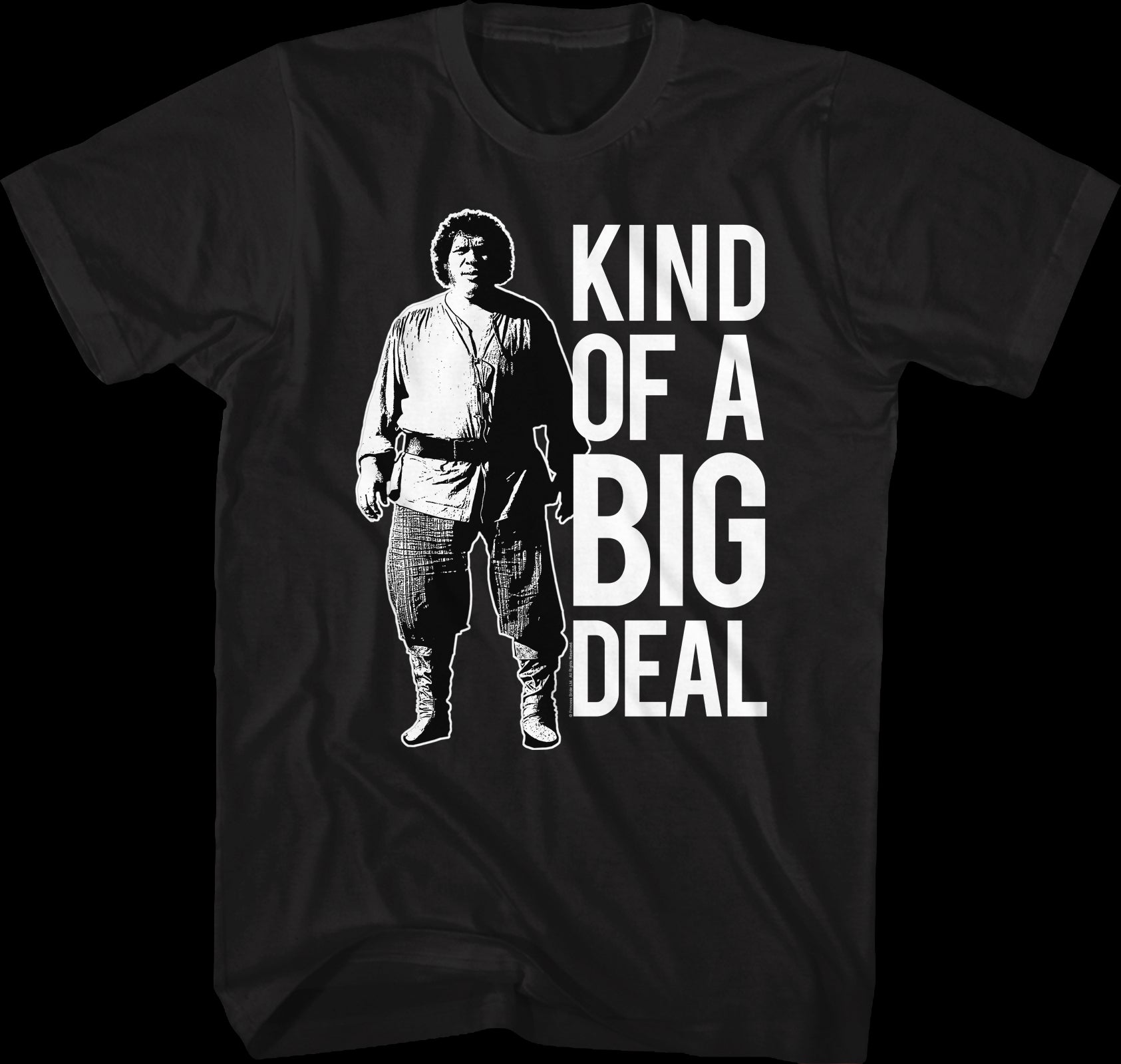 This Princess Bride t-shirt features a black and white image of Fezzik, the giant member of the Brute Squad. The shirt reads Kind Of A Big Deal.
