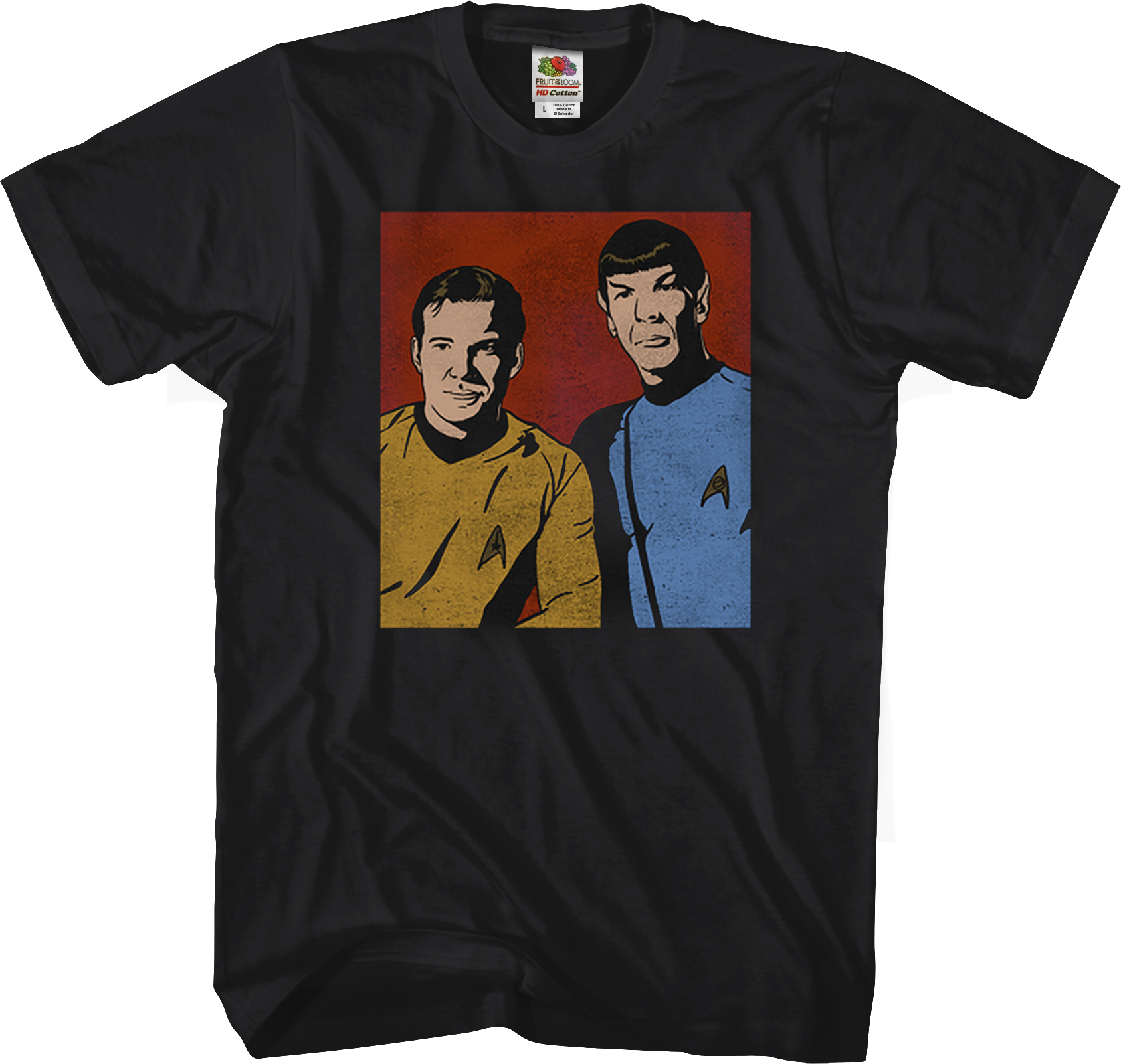 This Star Trek t-shirt features illustrations of the captain of the USS Enterprise James T. Kirk and the Enterprise's science officer Spock.