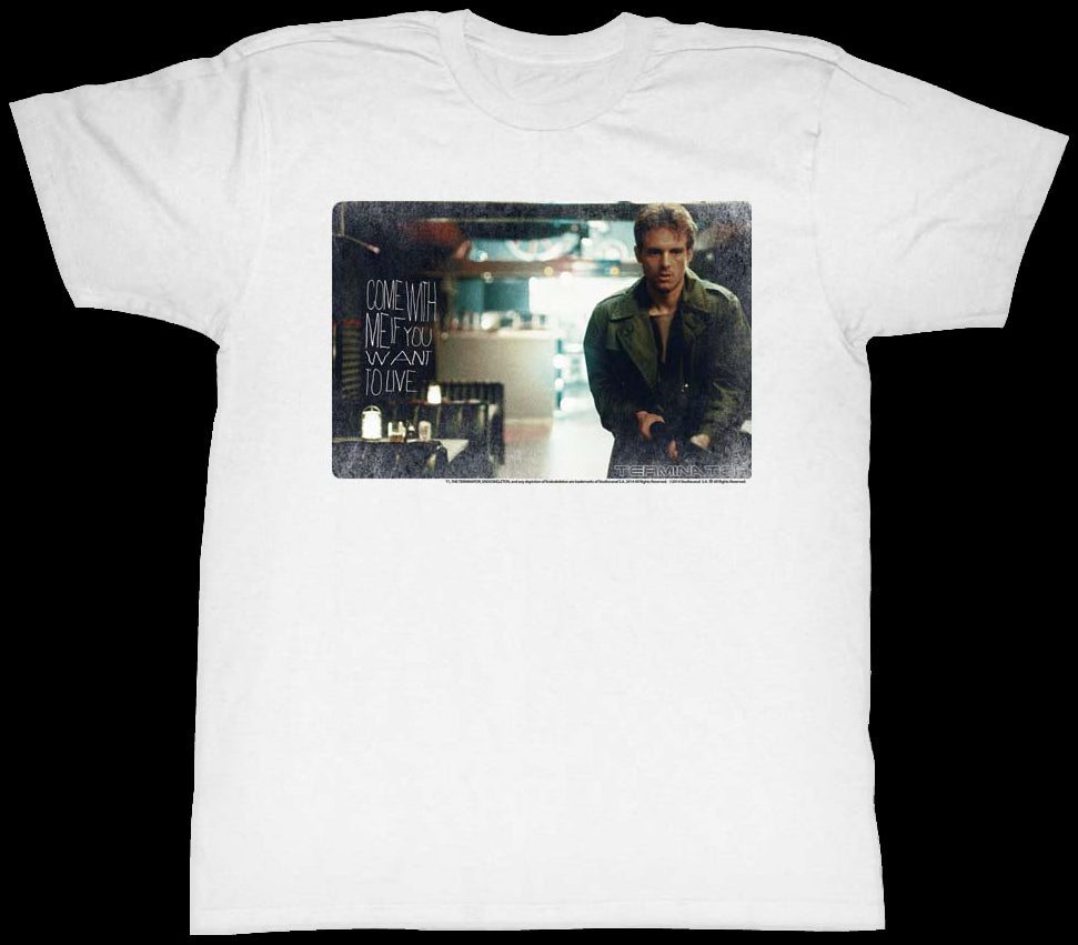 This Terminator t-shirt features an image of Resistance soldier Kyle Reese. The shirt reads Come With Me If You Want To Live.